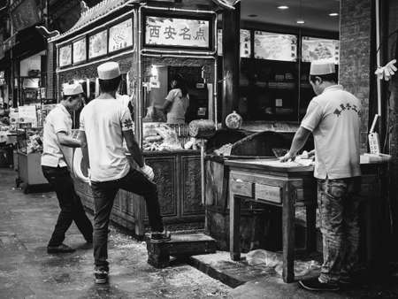 Xian, China - July 2019 : Meat, snacks, kabap vendor selling food on the street in the Muslim Quarter