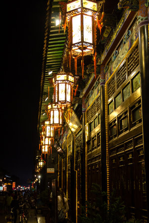 Aug 2013 - Pingyao, Shanxi, China - Traditional lamps at night in Pingyao South Street, one of the main of the Old town. Pingyao is a UNESCO world Heritage site