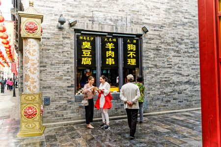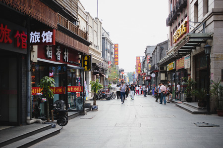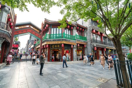 Beijing, China - May 19, 2016: people walking on Dashilan street, famous tourist place in Beijing, China