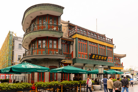 BEIJING, CHINA - DEC 19, 2017: Starbucks coffee shop in Chinese traditional style building on Qianmen street in Beijing at daytime
