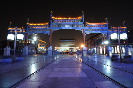 The night view of the archway and buildings on Qianmen Street in Beijing. China