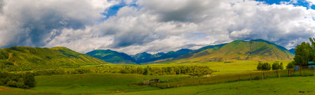 Grassland and mountains in a sunny day. Shot in Xinjiang, China.