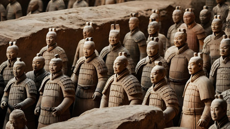 Terracotta warriors sculptures tomb. History pottery soldier art. Generate Ai