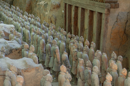 XIAN, SHANXI, CHINA - October 16, 2013: ancient Terracotta Army of Qin Shi Huang, the first Emperor of China, inside Terracotta Army crater in Lintong District, Xian City, Shanxi Province, China
