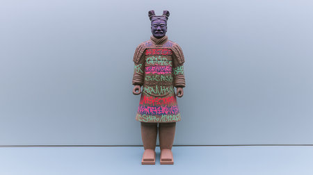 Close-up of terracotta figurine of ancient chinese warrior on rising sun background