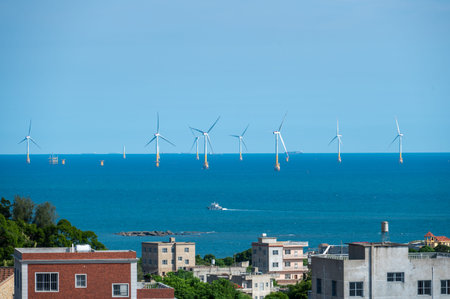 On the island in the middle of the sea, many wind turbines are installed under the blue sky