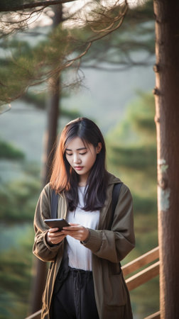 The young man is holding a mobile phone, taking pictures of the scenery at Pha Nok Aen. Phu Kradueng National Park, Loei Province
