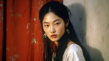 Symmetrical portrait of an East Asian model with glossy black hair and neutral makeup, photographed against a high-contrast backdrop of deeply textured, peeling black exterior wall paint.