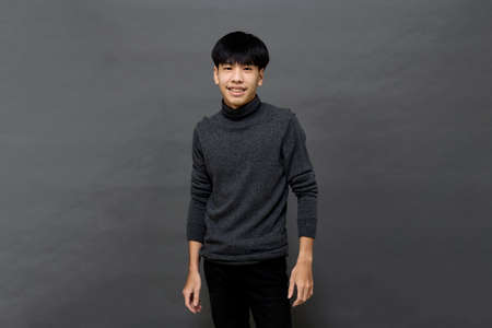 Handsome young man posing on vintage dark background. Portrait of satisfied Asian man against wall. Close up face of fashionable Asian man on wall background.