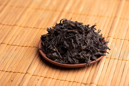 Close-up of crinkled dried black tea leaves, creating a textured organic background.