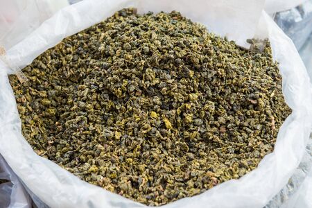 Closeup view of heap of green tea at traditional chinese street market in asian town. Bangkok, Thailand