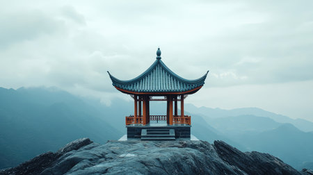 chinese pagoda overlooking vast expanse of misty mountains, with clear blue skies and white clouds, created with generative ai
