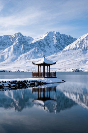 Quiet pavilions on the banks of the Snowy Mountains and Lakes, the Snowy Mountains and the Pavilion in the Heart of the Lake in the Mirror
