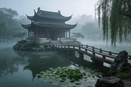 A serene wooden bridge leads to a traditional pavilion, surrounded by lush greenery and enveloped in misty rain. The tranquil atmosphere offers a peaceful escape into nature.