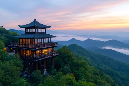 Beautiful wooden pagoda standing on mountain top during sunrise over misty valley