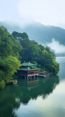 Traditional Chinese wooden building standing on a lake with green trees in the background