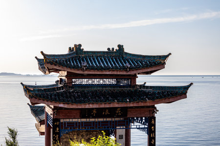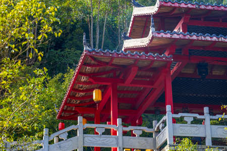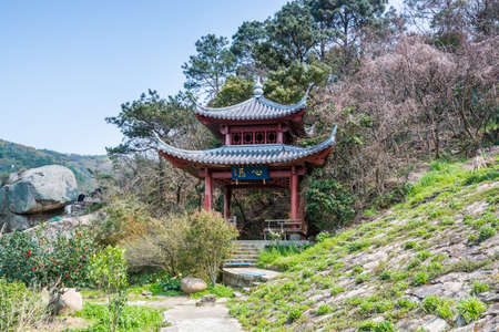 A Chinese traditional pavilion in the Temples in the Putuoshan, Zhoushan Islands, a renowned site in Chinese bodhimanda of the bodhisattva Avalokitesvara (Guanyin)
