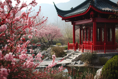 A traditional Chinese garden with a red pagoda and cherry blossoms AI generated