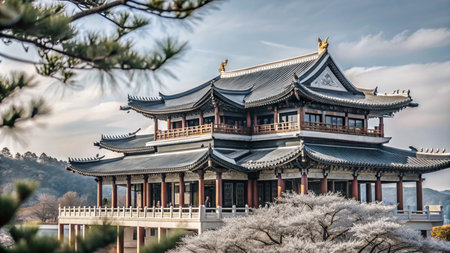 Stunning image of a traditional Asian building set against a soft background, showcasing intricate architectural details and a serene atmosphere.