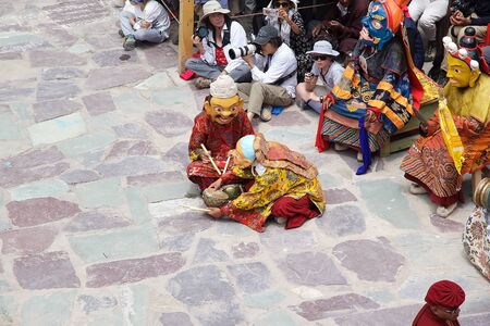 Spiti, Himachal Pradesh, India - March 24, 2019 : Tibetan buddhist lamas dressed in mystical mask dance Tsam mystery in time of festival in himalayas