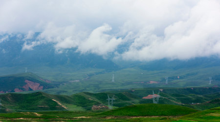 The power facilities on the Qinghai Tibet Plateau present a beautiful picture of the white clouds, meadows and distant mountains