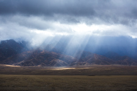 Light rays through glowy clouds. Mountains of Kazakhstan