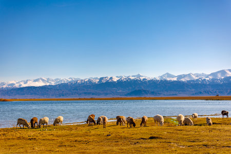 flock of sheep grazing on shore of mountain lake at sunny autumn afternoon, telephoto view with selective focus