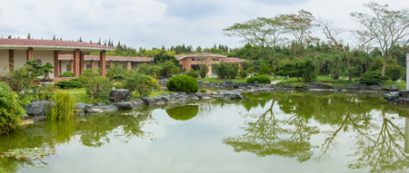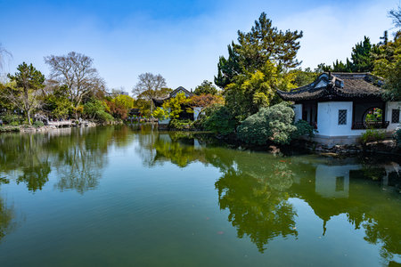 Beautiful view of Chinese garden with pond and trees in the foreground