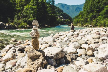 zen stones in equilibrium pyramid at a pebble river beach - concept of equilibrium with nature