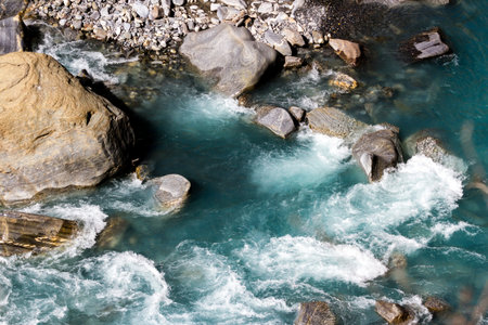 Stony river bed with white water in Taroko National Park, in Hualien Taiwan.