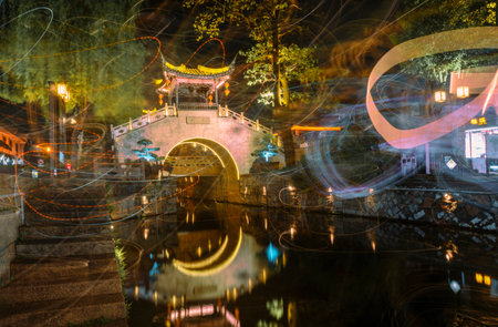 Traditional chinese architecture: illuminated bridge at sunset reflection.