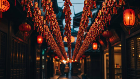 Traditional red lanterns decorating a narrow alleyway with centuries old brick walls in China, creating a charming and atmospheric scene