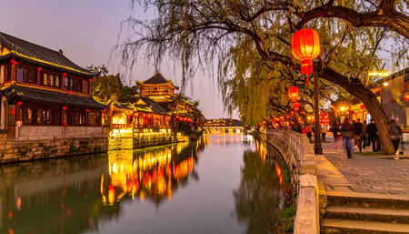 Visitors stroll through a lively street adorned with red lanterns during the evening in an ancient market