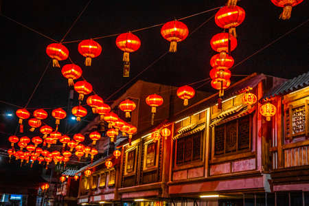 A series of red Chinese lanterns are illuminated along a narrow alleyway, creating a vibrant and festive atmosphere.