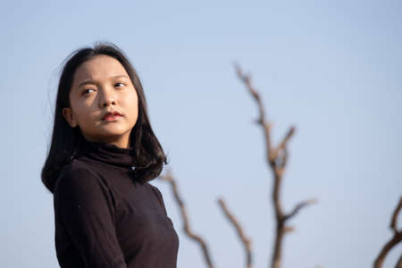 young beautiful asian woman in sport jacket on blue sky and clouds background