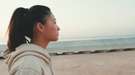 Close-up profile asian girl wears sportswear walking outside at morning time
