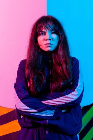 Young confident provocative teen woman in tracksuit looking at camera standing with crossed hands on colorful background in neon light