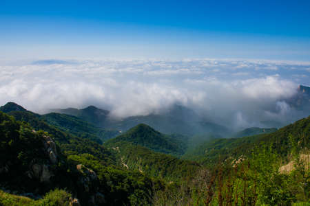 Mountain landscape covered in clouds on top of Wugong Mountain in Jiangxi, China