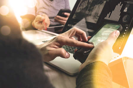 Business team meeting present. Photo professional investor working with new startup project. Finance managers meeting.Digital tablet laptop computer design smart phone using. Sun flare effect
