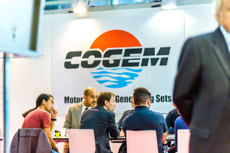 BOLOGNA, ITALY – NOVEMBER 10, 2018: Booth presenter welcoming business visitors at EIMA 2018, International Agricultural and Gardening Machinery Exhibition