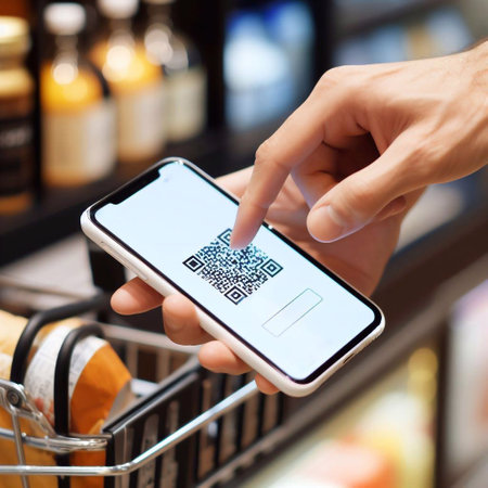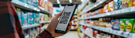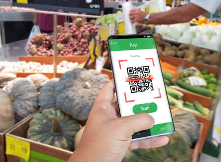 scanning QR codes with a mobile phone application and paying for goods and services in the retail supermarket background