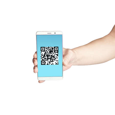 Mobile QR code. Smartphone in hand of man. Scan QR key. Concept of authorization using bar code. Metaphor of identification via QR link. Quick Response code. Dot matrix barcode in phone