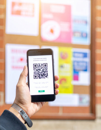 A person uses their smartphone to scan a QR code on a public bulletin board, instantly accessing digital information for a local event.