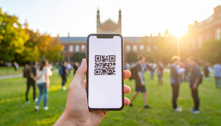 A student holds up a smartphone displaying a QR code for digital check-in at a university campus event.