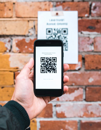 A person holds a smartphone to scan a QR code on a sign against a rustic brick wall.