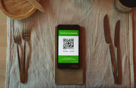 Smartphone app with certificate of immunization in restaurant. Status is valid.