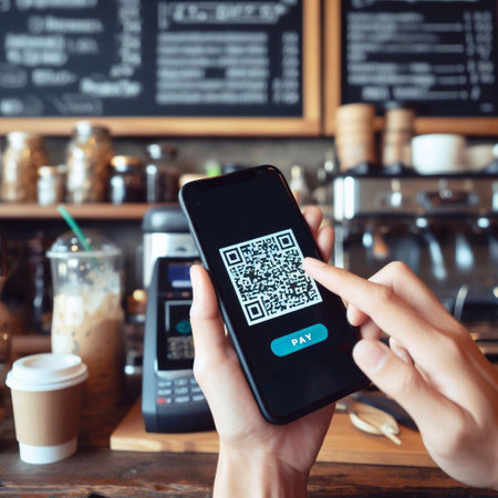 Hands and phone close-up, scanning QR code on mobile phone, paying in store,generative ai illustration
