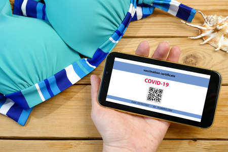A mans hand holds a mobile phone with a digital certificate against Covid-19 in front. Business and tourism concept of travel during coronavirus pandemic