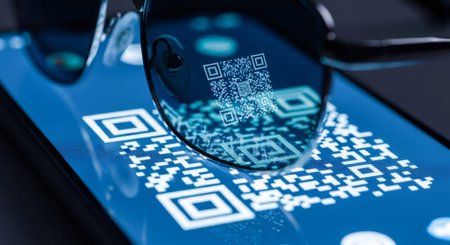 QR code reflection on eyeglasses lens from phone screen. Digital payment system for contactless transaction. Future innovation technology.
