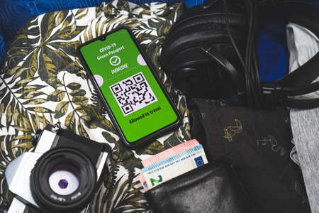 COVID-19 Green vaccine passport. Digital green verification document which allow people freely travel around Europe and world
